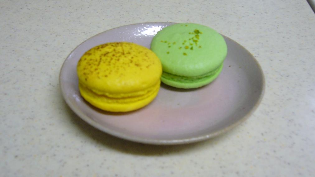 タイトル通りのマカロンです。右がピスタチオで左がパッションフルーツです。