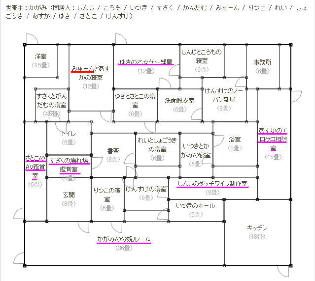知っている人もいると思いますが、やったことない人に言うと名前を入力してenterを押すと、勝手に入力した名前を使って名前にあった間取りを作ってくれます。ちなみに名前は20人まで入力することが出来て、周りの人を巻き込んで楽しむといいと盛り上がると思います。