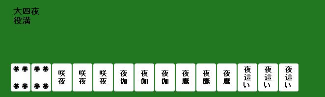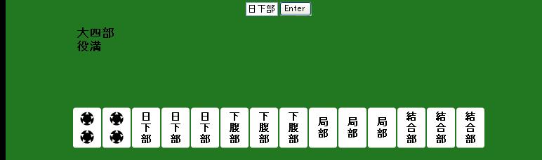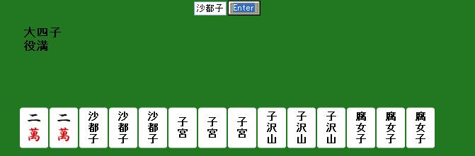 麻雀が趣味なのでこういうのもしてみました。上で紹介したURLのページの上に「麻」と書いてあるのでそれをクリック。漢字三文字以内で入力するとツモったときにどんな役が作れるか調べれます。もちろんありえない役もあります。てか、そんな役ねーよwみたいなものもあります。