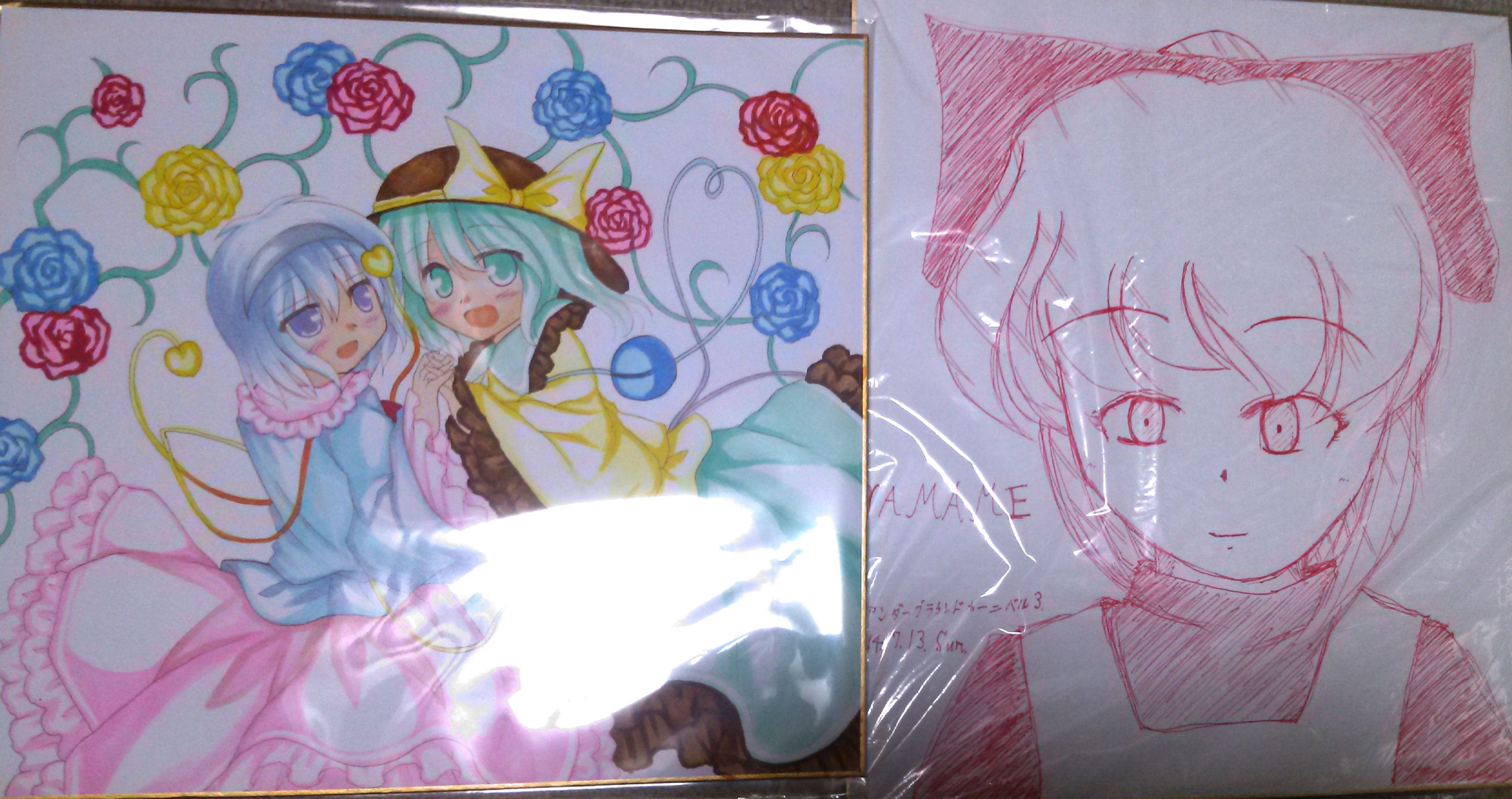 左側の色紙ですが、どうやらオークションで落札者が現れなかったそうです。スケブもそうですが、オークションでもちゃんとお願い・参加したのならばちゃんと受け取りにいってくださいねー。困ってしまうのはサークル主の方なのですから。